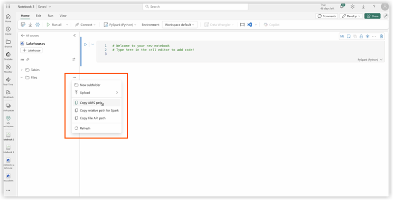 - Haga clic en los puntos suspensivos en los archivos y seleccione Copiar ruta ABFS:
