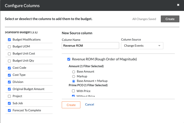 This adds a source column named 'Cost ROM' which shows a ROM estimate for change events. The value that appears in this column on a budget line item is not yet associated with a CCO, an RFQ, or a Non-Commitment Cost.