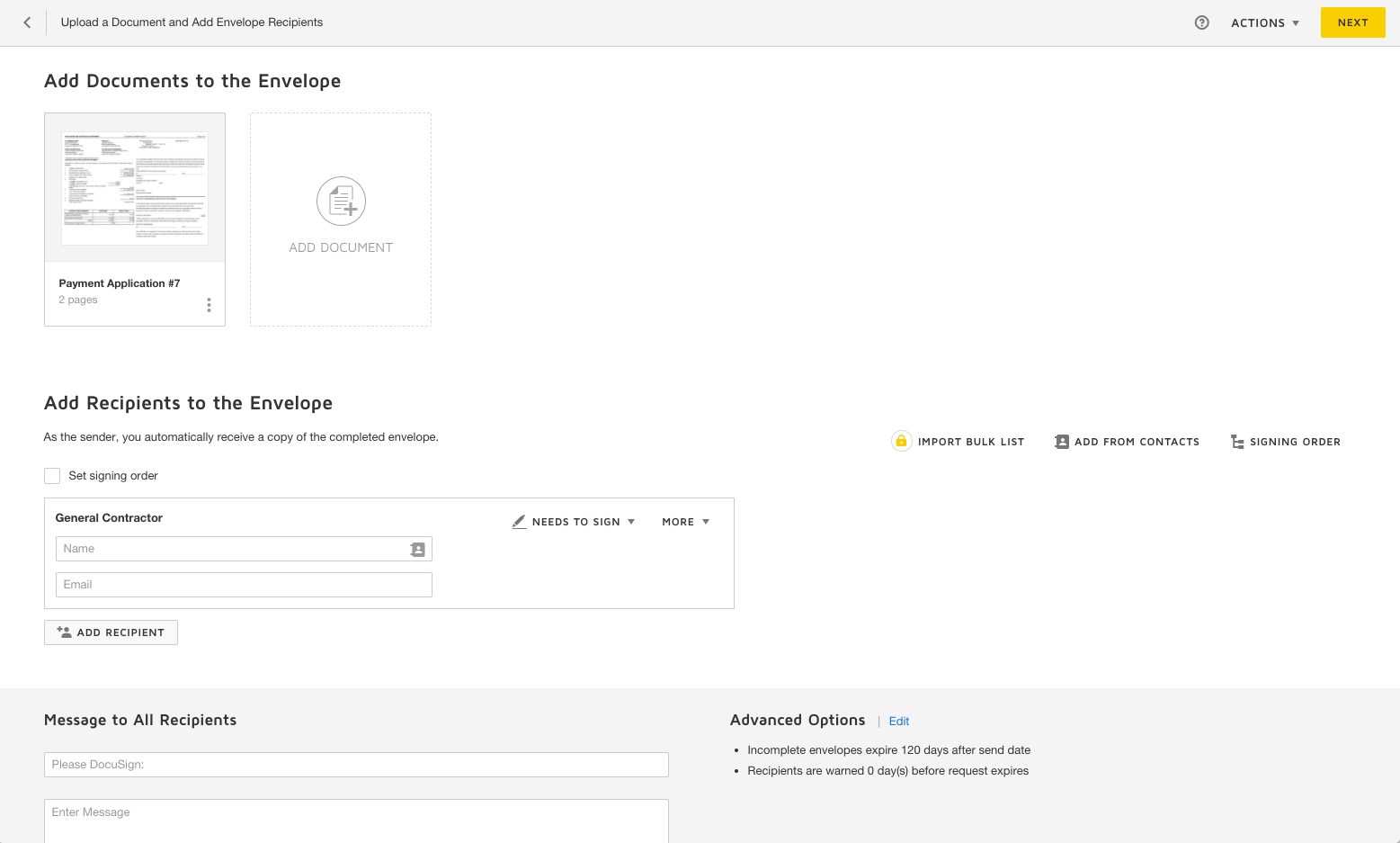 - Una vez que esté en DocuSign®, el PDF del contrato de Procore se completará previamente como un documento en DocuSign®, o puede optar por agregar su propio documento.