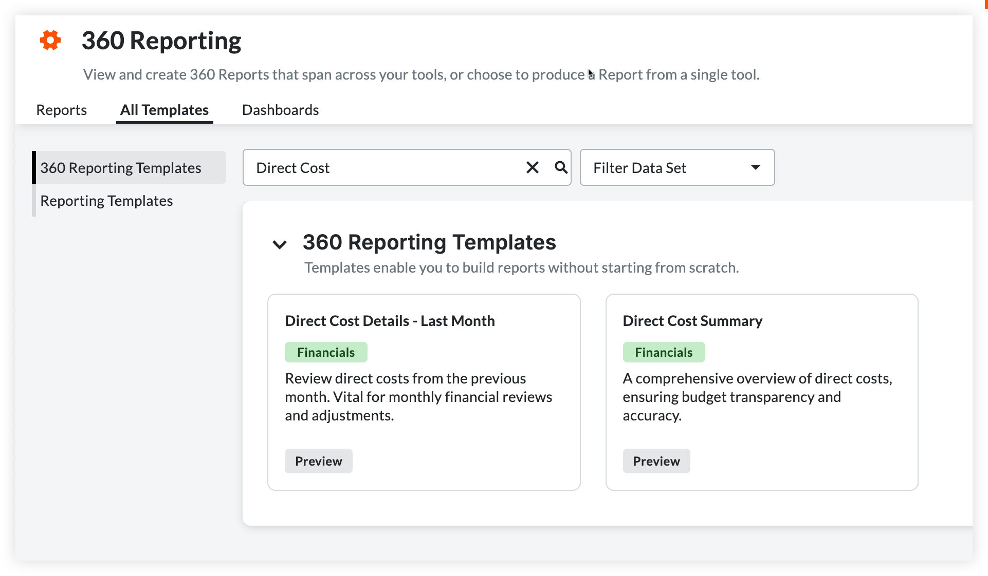 - Para plantillas de reportes de proyectos: permisos de nivel "Estándar" o superiores en la herramienta Reportes 360 Y acceso a todos los conjuntos de datos que utiliza esa plantilla.