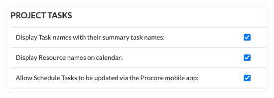 - Permitir que las tareas de programa se actualicen a través de la móvil aplicación de Procore: Marque la casilla de verificación para permitir que las tareas de programa se actualicen a partir de un móvil dispositivo utilizando la móvil aplicación de Procore.