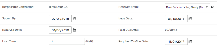 - Fecha de vencimiento. Seleccione una fecha del calendario para que venzque la respuesta al submittal.
