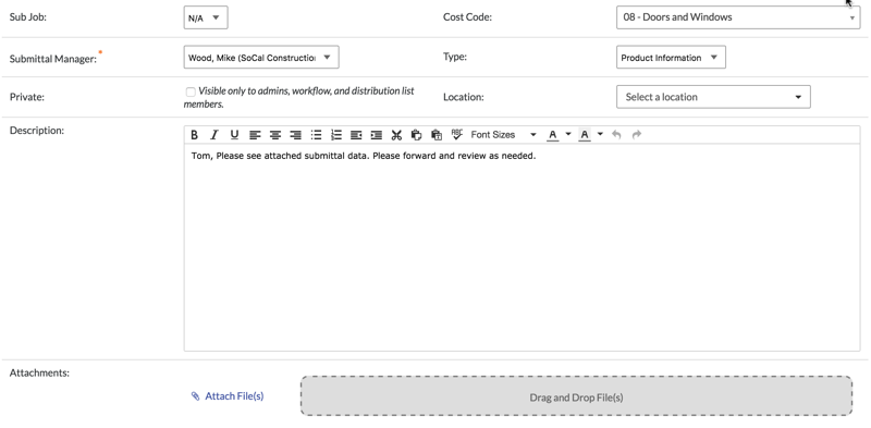 Los usuarios con permiso estándar para la herramienta Submittals están limitados a ver los siguientes campos al crear un nuevo submittal: